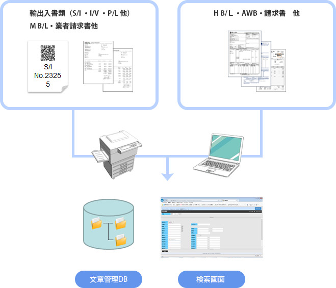 - Integrate with the operation process management and save the shippers’ INVOICE/PACKING LIST, all the arrangement document such as cargo-handling, B/L, AWB, declaration permit, etc. Read the output QR code with the multifunctional machine to save all together in the document control DB.